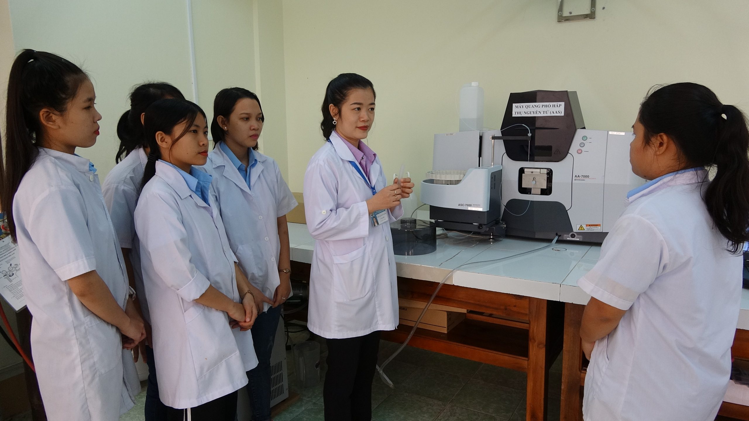 Cô Phan Thị Thiên Trang hướng dẫn sinh viên sử dụng máy Quang phổ hấp thụ nguyên tử (AAS)