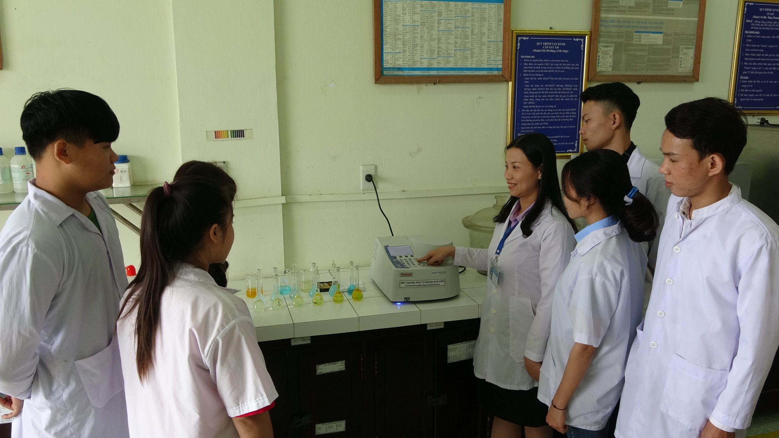 Cô Đào Thị Sương hướng dẫn sinh viên sử dụng máy đo độ nhớt các sản phẩm dầu mỏ