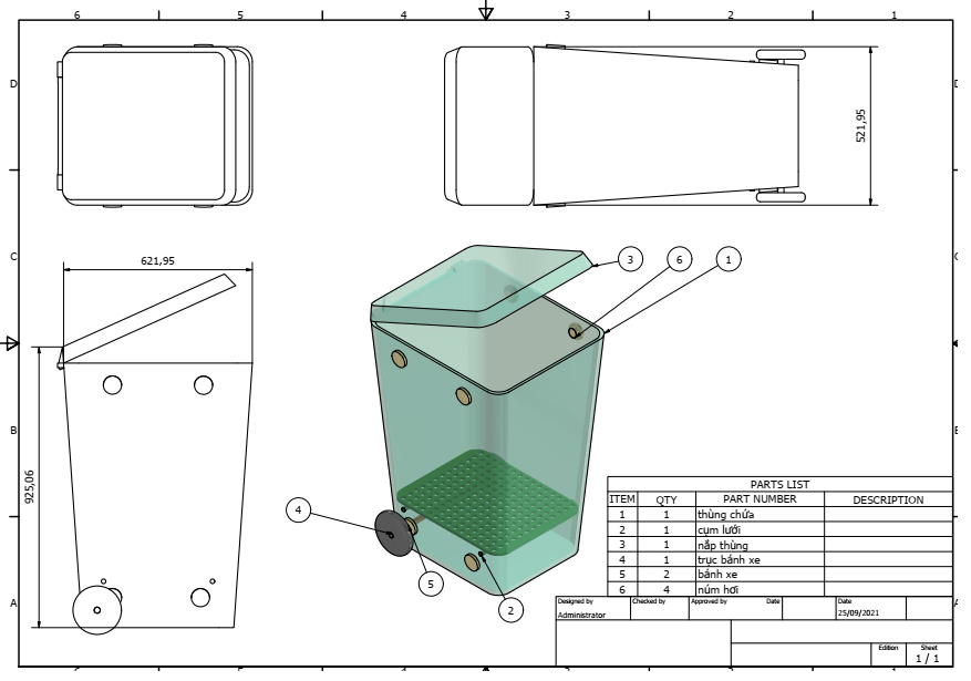 Trên đây là những giải pháp quản lý cơ bản, tuy nhiên để việc giảm mùi rác thải hiệu quả tại các điểm tập kết rác thì cần phải có giải pháp kỹ thuật – Đây là nội dung trọng tâm của bài viết này. Thực tiễn cho thấy, mùi của rác thải là chất hữu cơ, nhất là rác thải động vật phân hủy kị khí. Nếu triệt tiêu sự phân hủy kị khí sẽ giúp giảm mùi hiệu quả. Giải pháp đơn giản nhất là tăng tần suất thu gom rác, tuy nhiên giải pháp này cũng không giảm mùi triệt để và không phù hợp với khu vực nông thôn, miền núi. Tác giả đề xuất sử dụng thùng rác có cấu tạo như sau để thu gom rác ở các điểm trung gian trước khi vận chuyển đến khu vực xử lý tập trung.