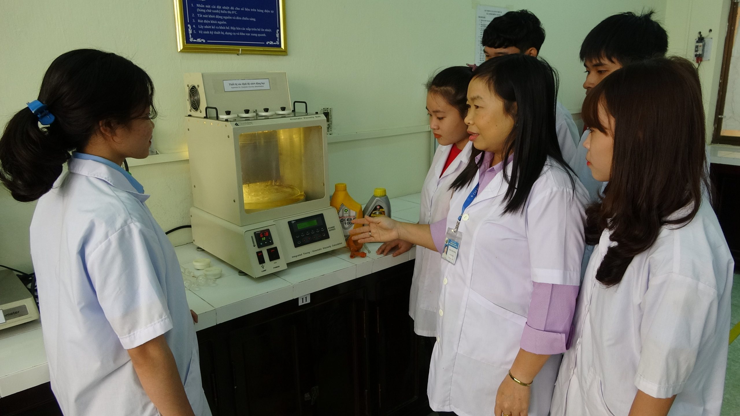 Cô Đào Thị Sương hướng dẫn sinh viên sử dụng máy đo độ nhớt các sản phẩm dầu mỏ