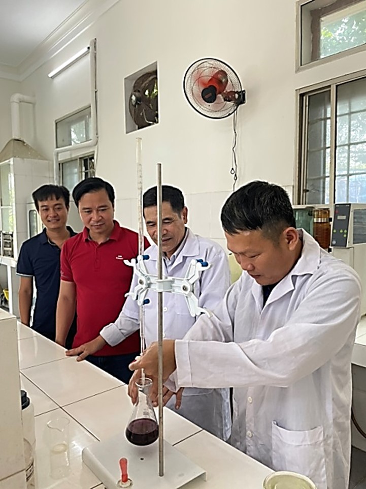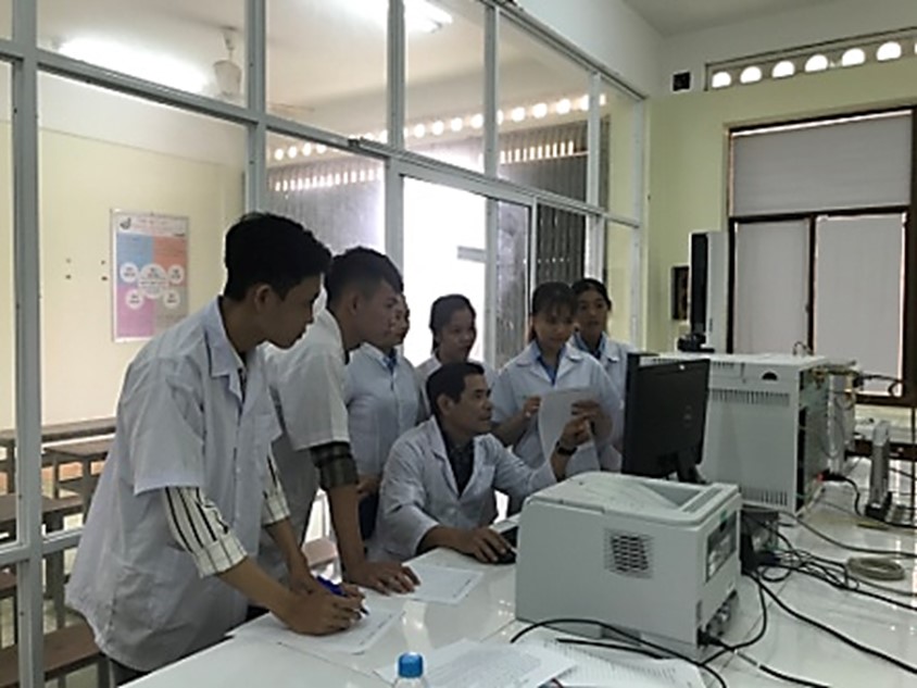 Hình 2. Thầy và trò đang thực hành thiết bị hiện đại trong lĩnh vực kiểm tra thực phẩm, dược phẩm, môi trường.